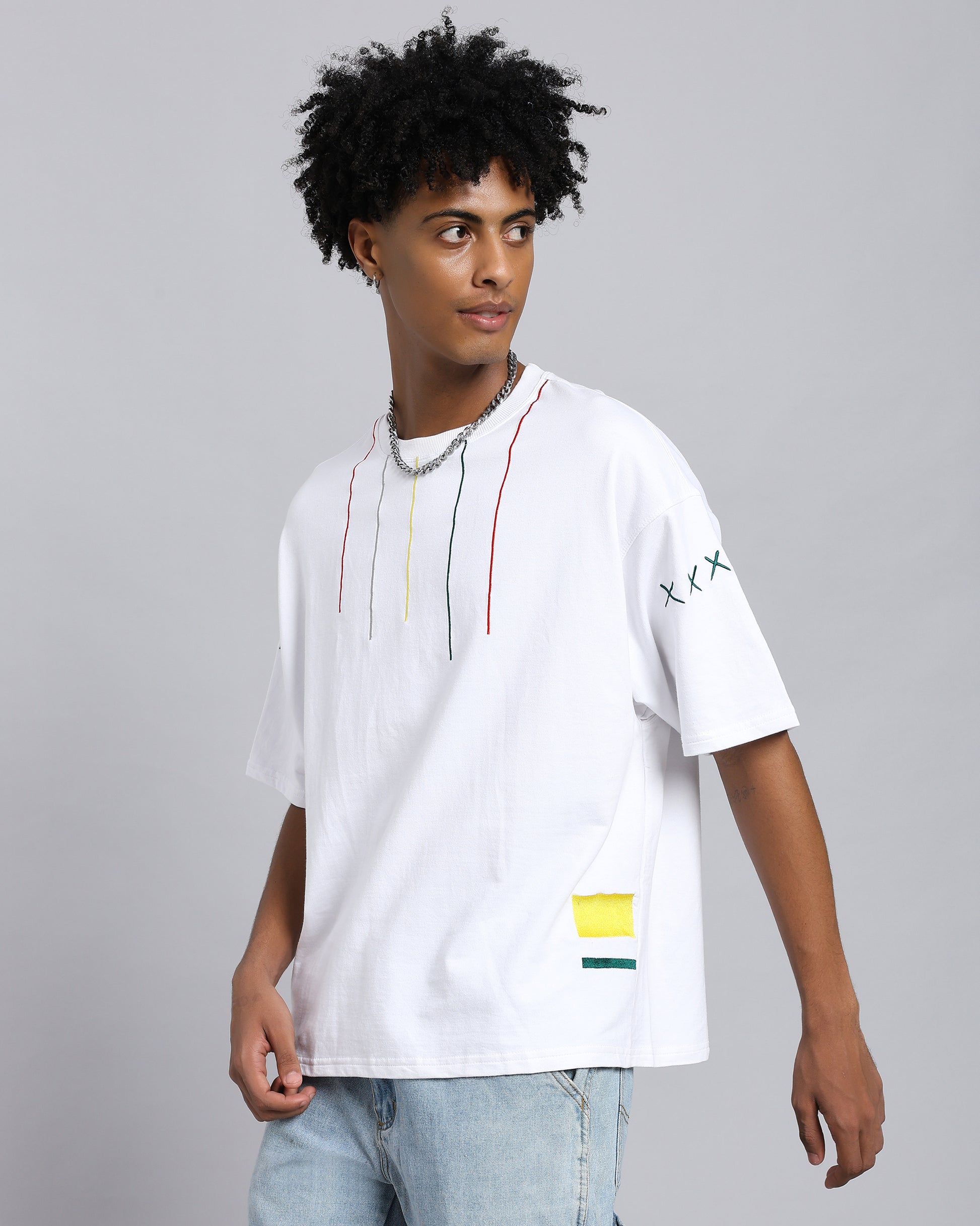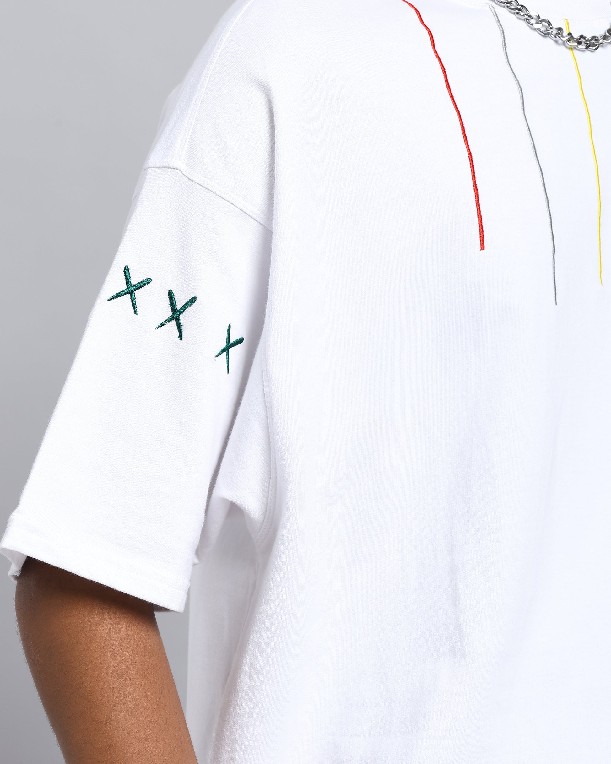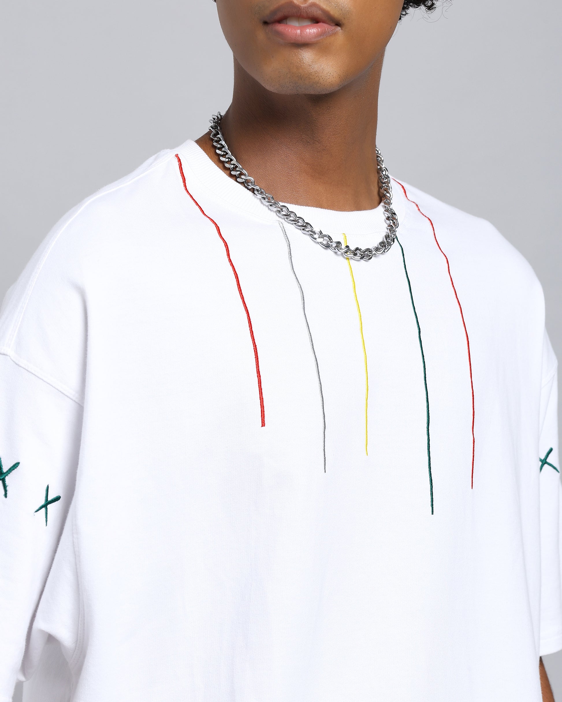 This one has a minimalist, modern-art vibe with its clean white base, colorful vertical lines, and small geometric accents. It feels sleek and abstract — almost like wearable art. All embroidered with perfection.