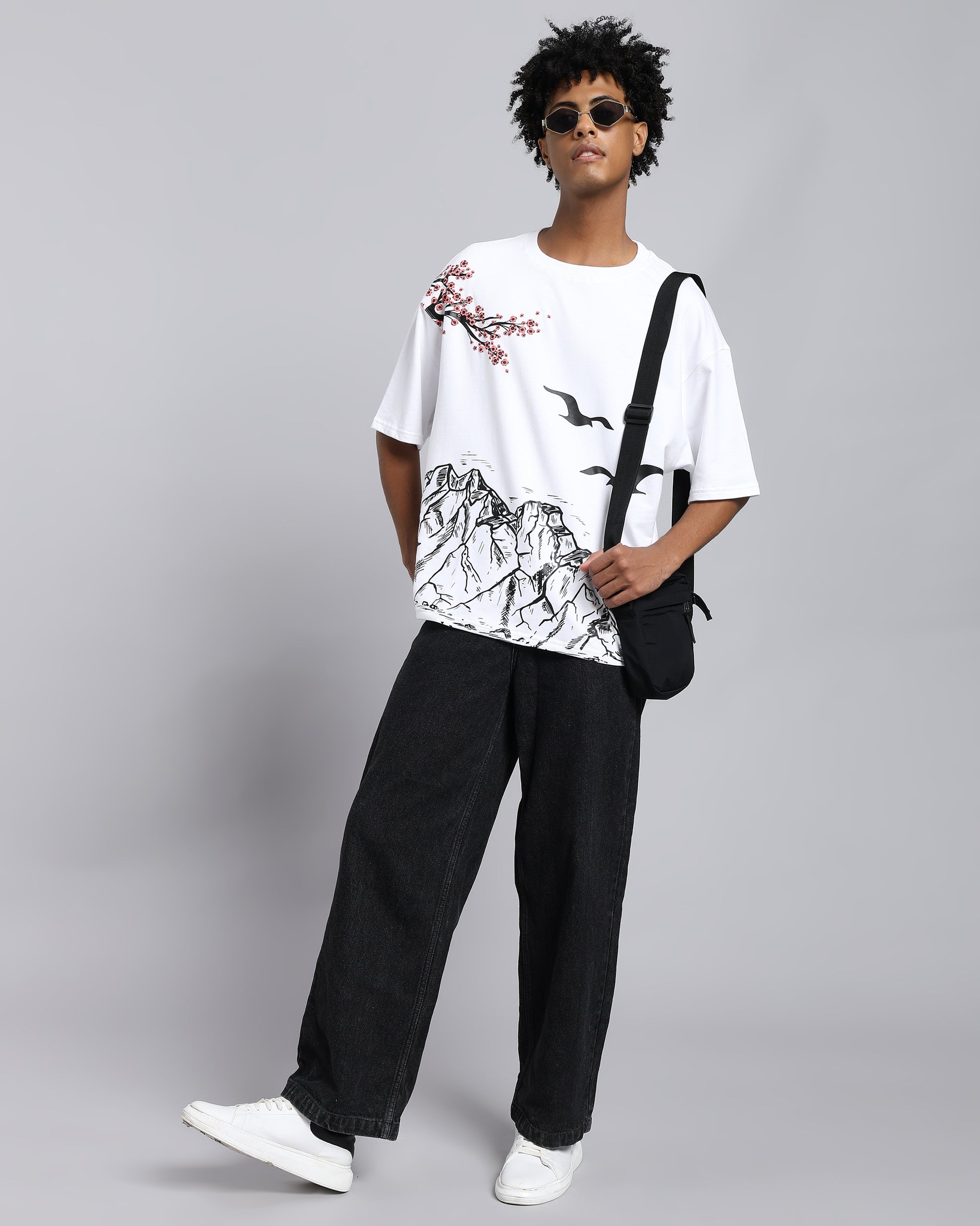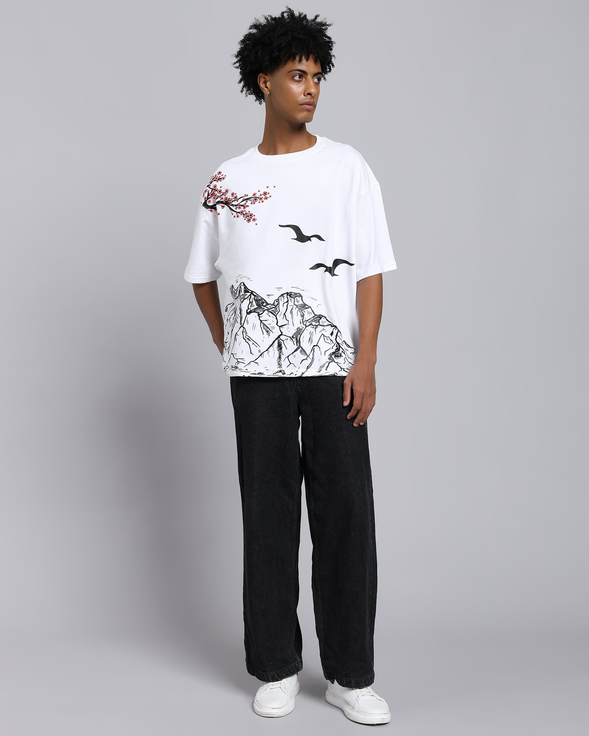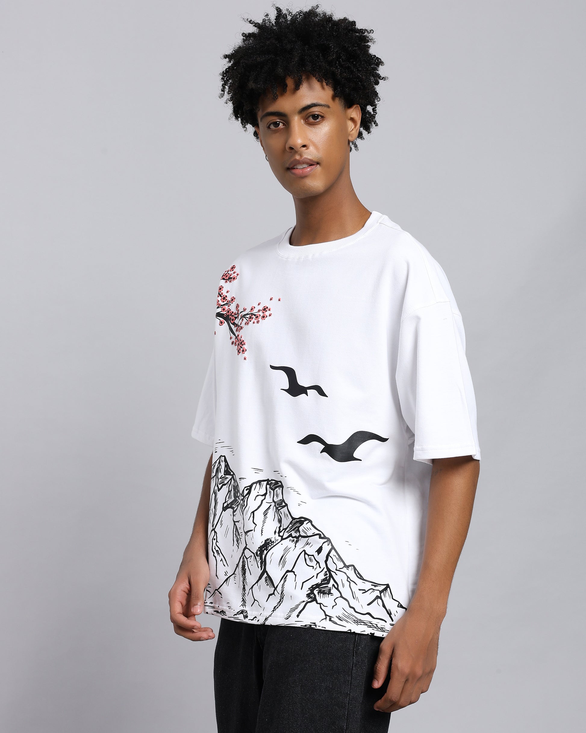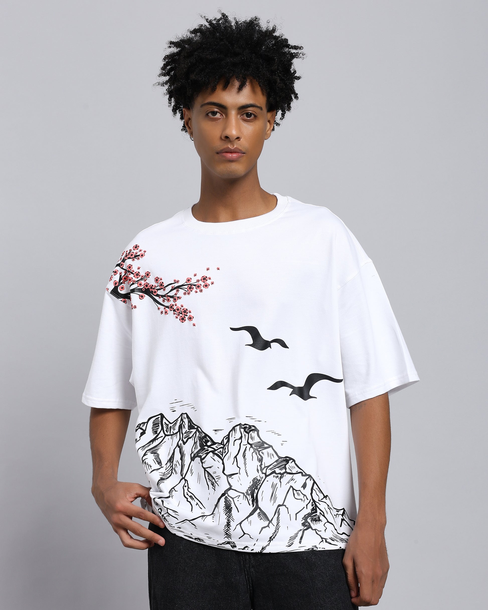 Represents the fusion of rugged mountains and delicate blossoms using puff print — strength and beauty in one.